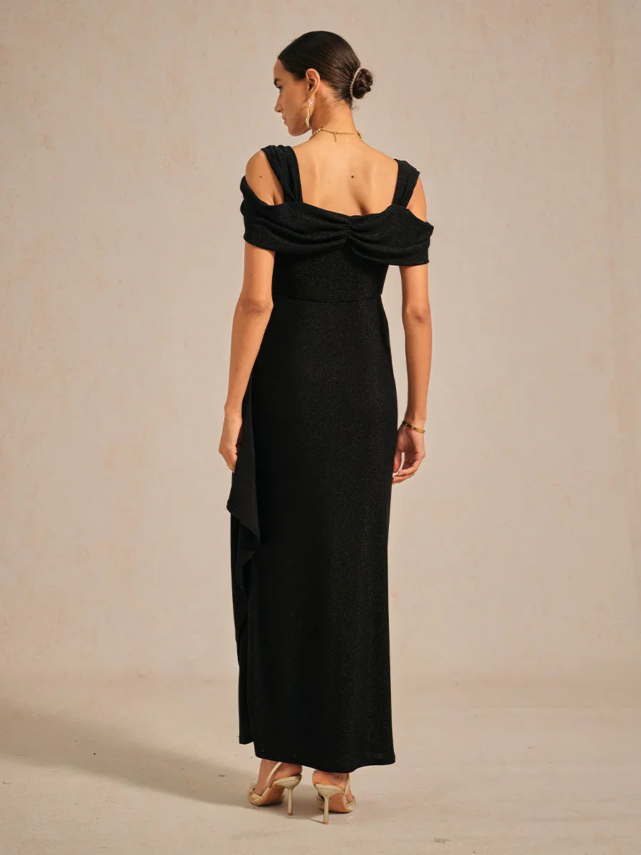 Turn heads in this stunning ankle-length metallic knit dress. Designed with cold shoulder sleeves and a graceful cowl neckline, the soft draped silhouette flatters your figure while adding elegant movement. A perfect choice for formal occasions, weddings, or special celebrations.