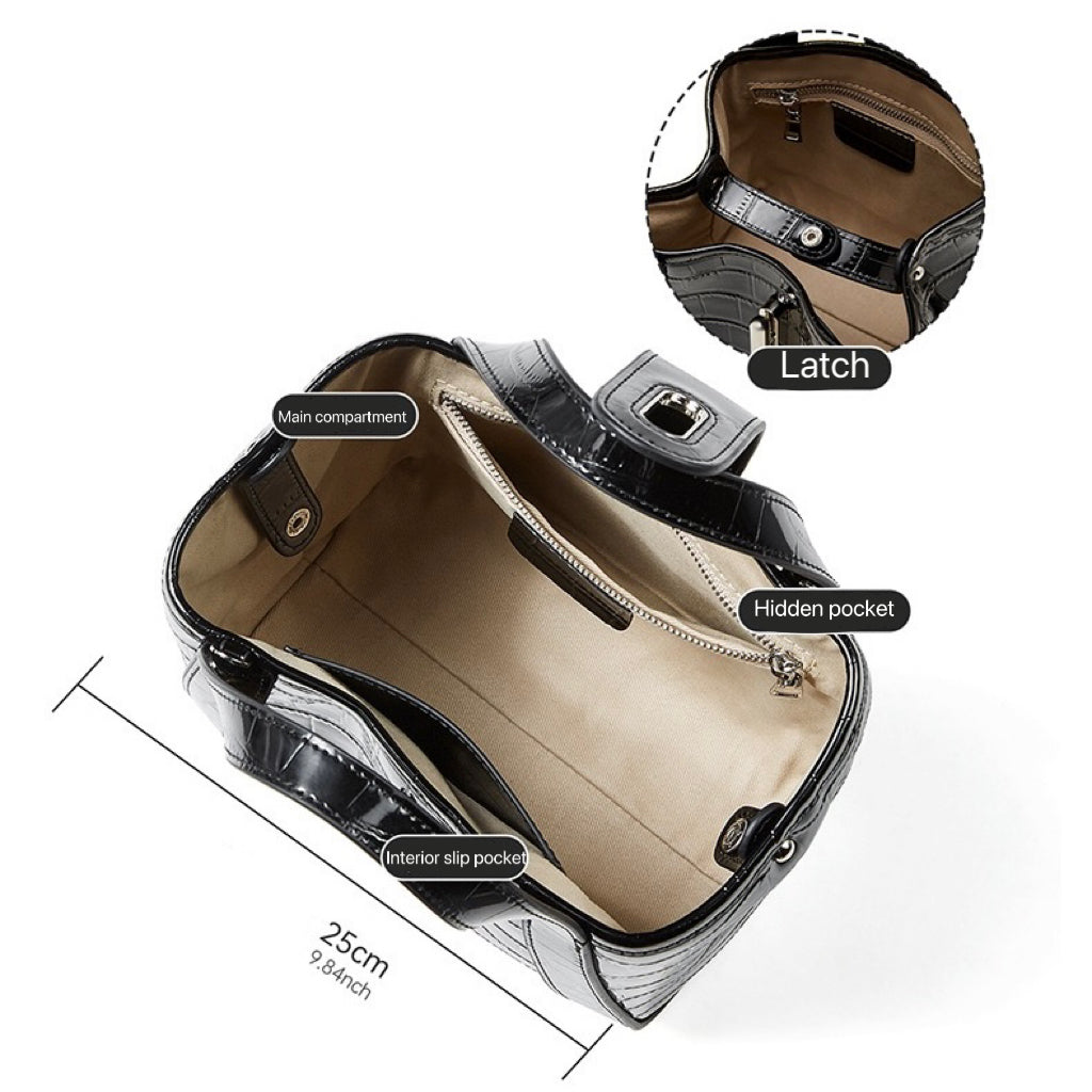 Crafted from premium genuine leather, this Crocodile Pattern Compact Basket Style Handheld Crossbody Bag features a trendy crocodile texture and a practical medium size—ideal for daily styling. It boasts a classic bucket shape, secure lock closure, and soft fabric lining. Inside, a hidden zipper pocket keeps small essentials like keys or cards organized. With medium hardness, it balances structure (to hold its shape) and comfort for all-day carrying. Blending high-quality leather, eye-catching crocodile details, and functional design, it effortlessly elevates casual or semi-formal daily looks.