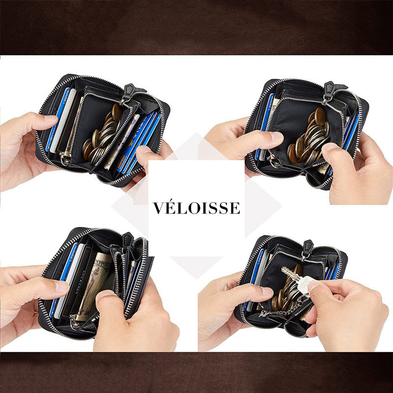 This genuine leather wallet fits up to 8 cards. It features an exclusive compartment for coins and two separate sections for cash notes, balancing premium texture with practical organization.