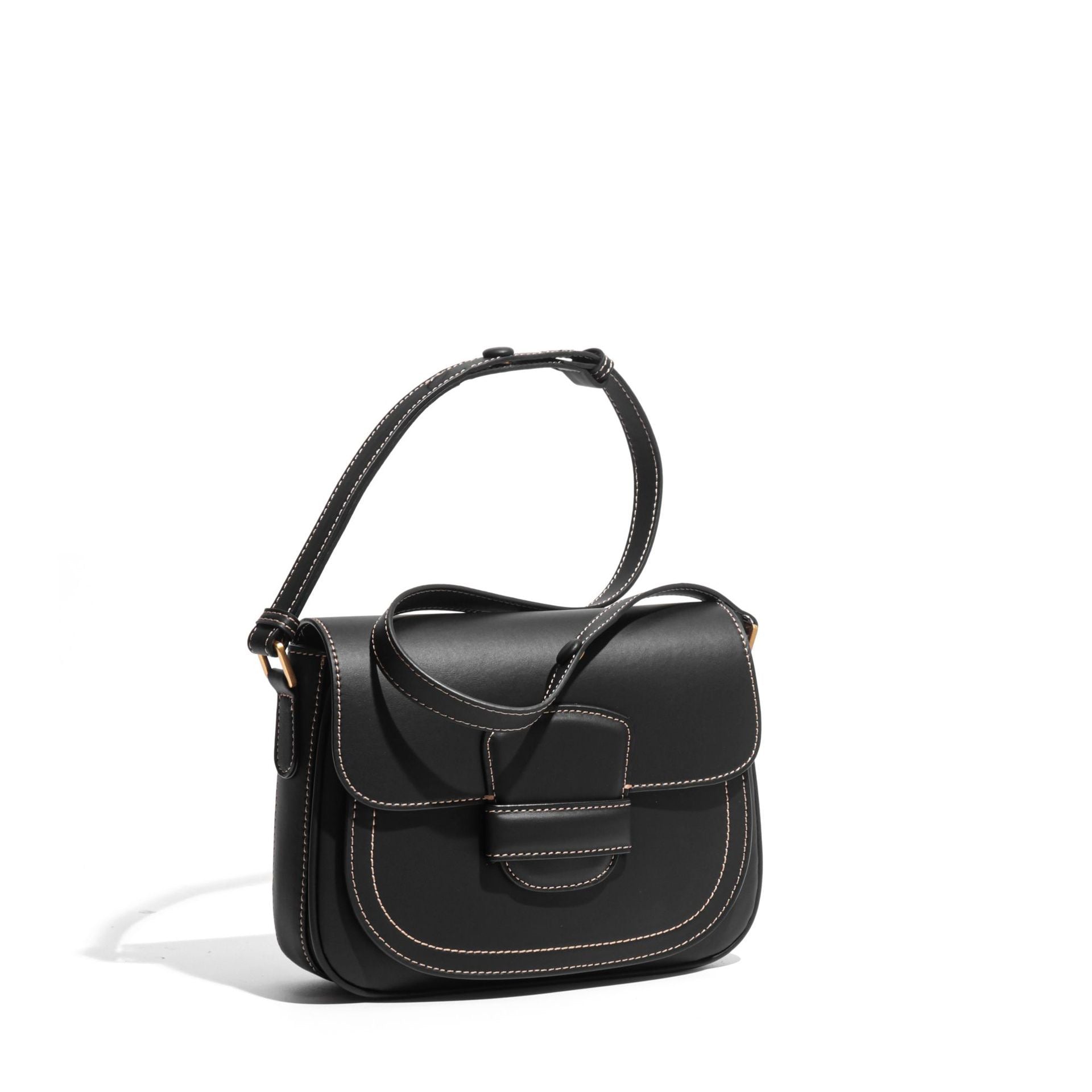 This Women's Contour Stitch Genuine Leather Saddle Bag embodies urban minimalist style, crafted from premium genuine leather with neat stitching for subtle sophistication. It features a medium-sized horizontal square shape—ideal for daily essentials—and a convenient flap closure for easy access. Lined with durable cotton-polyester fabric, the interior includes a phone pocket and a document pocket to keep your items organized. With medium stiffness that maintains its sleek form, this saddle bag blends high-end quality with practicality, making it a perfect companion for urban commutes or casual outings.