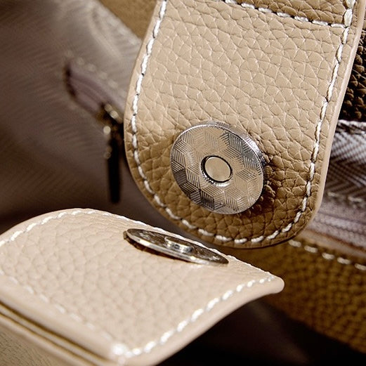 Crafted from genuine top-grain cowhide, this medium-sized Women's Genuine Leather Bucket Bag with Little Elephant Pendant boasts a trendy bucket style with a cylindrical shape. Adorned with a cute little elephant pendant, it blends fashion and charm. The magnetic closure ensures easy access, while the polyester-cotton lining includes a phone pocket for convenience. With medium hardness, it’s a versatile accessory perfect for daily outings, merging functionality with stylish design.