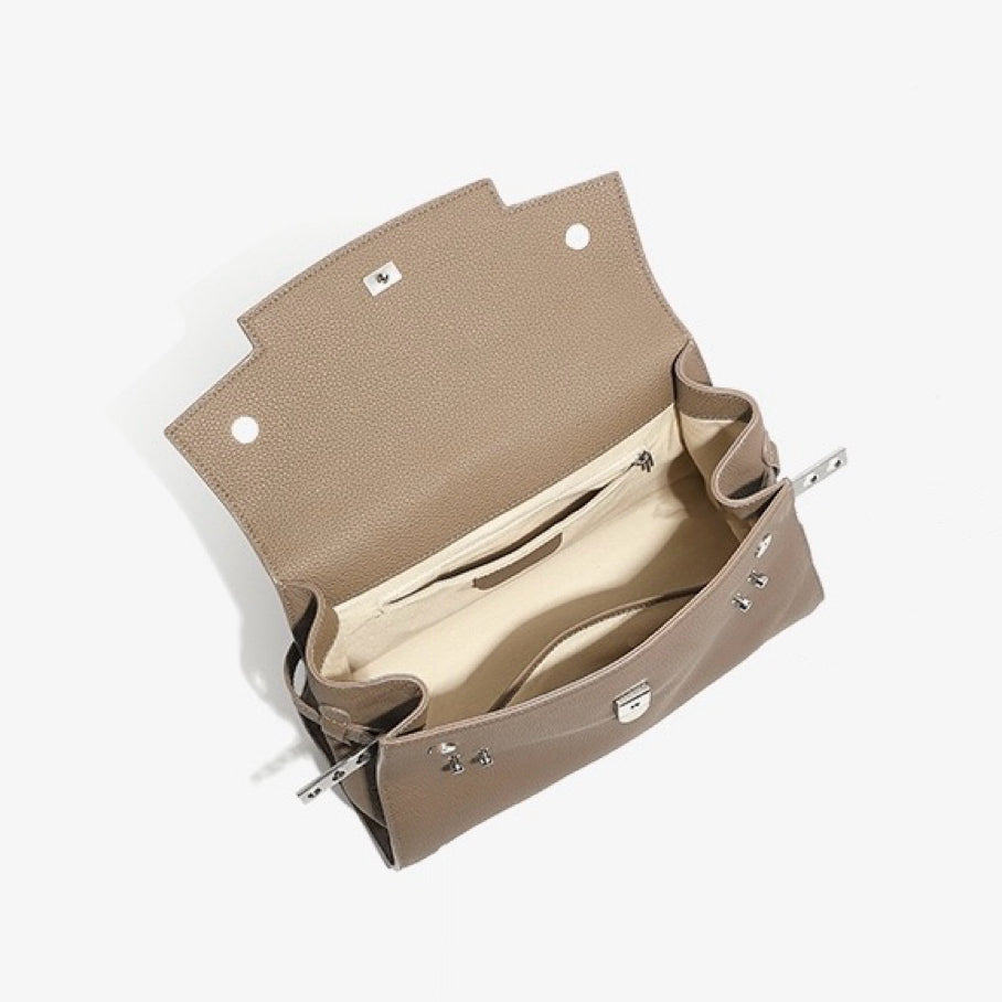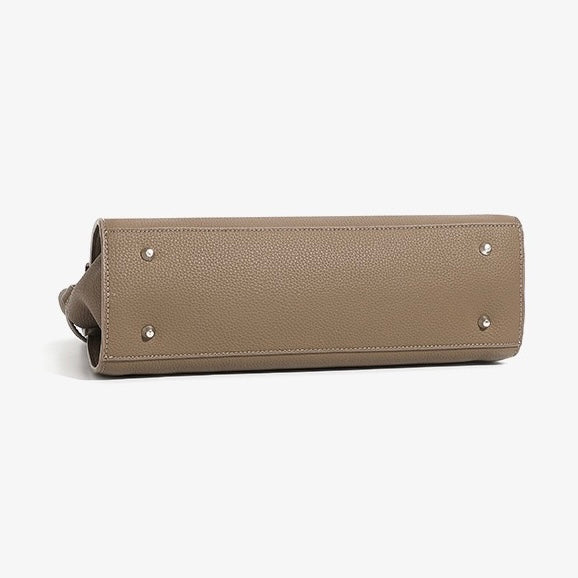 Crafted from premium top-grain genuine leather, this medium-sized horizontal square tote combines minimalist style with practicality. A sleek solid color design enhances its versatility, perfect for daily use. Featuring a secure clasp closure and medium hardness, the fabric-lined interior includes a zippered secret pocket and document pouch. Spacious yet stylish, it seamlessly transitions from shoulder carry to handhold, elevating any outfit with understated elegance.