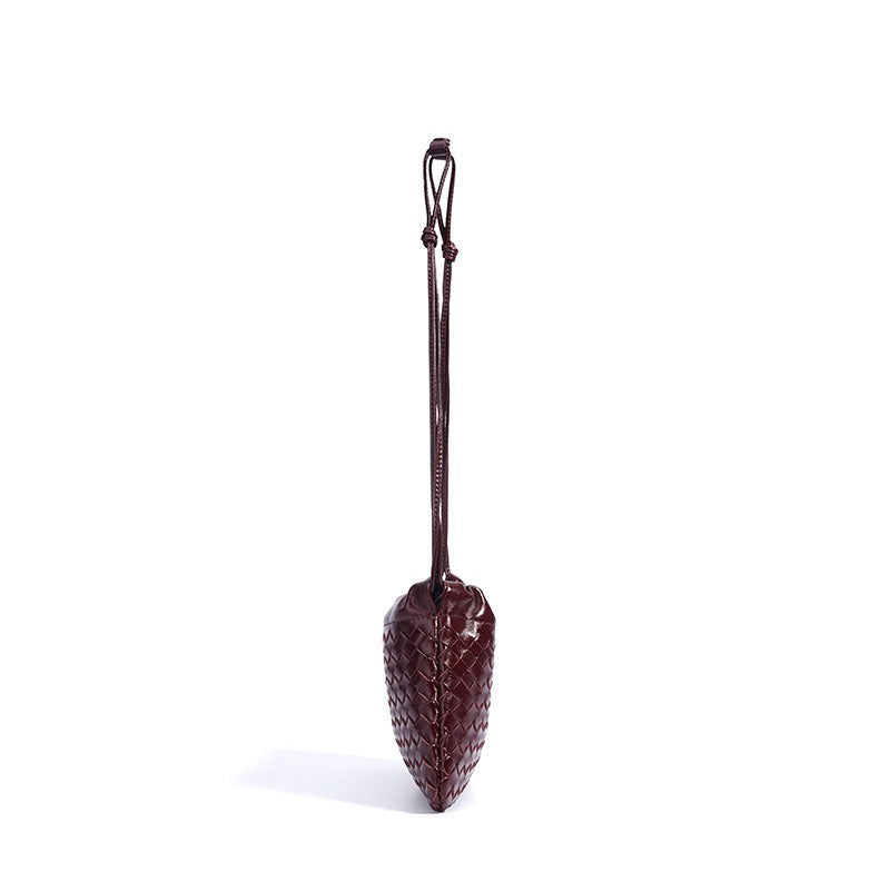 This Genuine Leather Sheepskin Woven Exquisite Ladies Crossbody Bag is crafted from soft genuine sheepskin leather, featuring a trendy cloud bag silhouette in small size. The delicate woven details add an elegant texture, secured with a drawstring closure for easy access. Inside, it includes a document pouch for essentials, lined with fabric for durability. With a soft texture and single shoulder strap, it offers lightweight and comfortable crossbody wear, perfect for daily styling. Combining luxury sheepskin and intricate weaving, this compact bag brings subtle sophistication to everyday outfits.