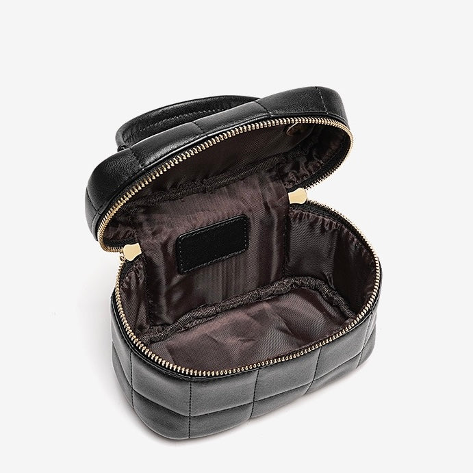 Crafted from premium cowhide, this medium-sized textured chain shoulder crossbody bag features a trendy cylindrical style with a square box shape. Adorned with classic quilted patterns, it blends fashion and functionality. The smooth zipper closure ensures secure access, while the polyester-lined interior offers a spacious main compartment for essentials. With medium hardness, it’s perfect for daily outings, adding elegance to any look.