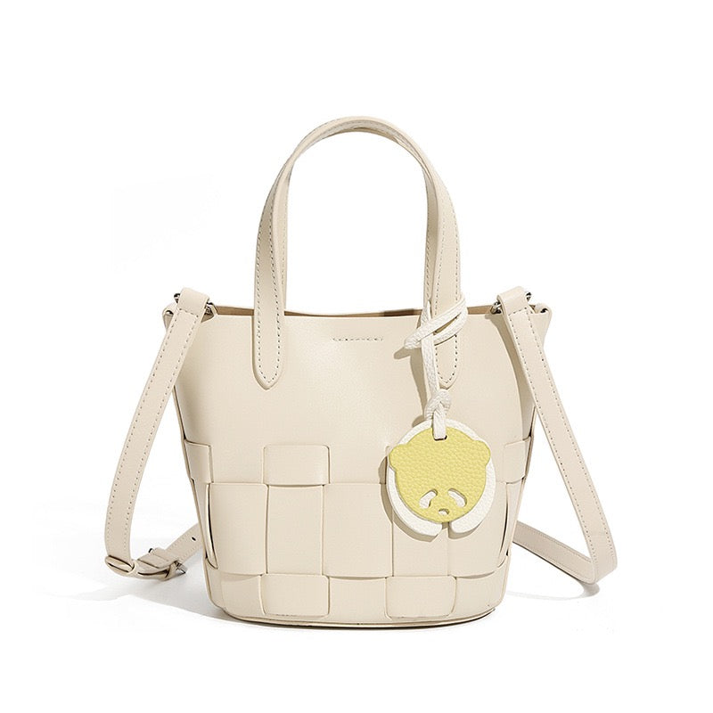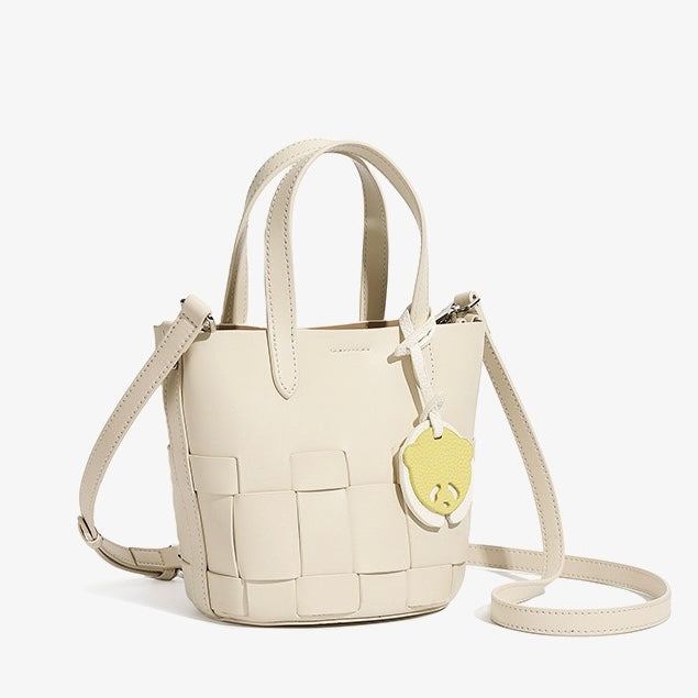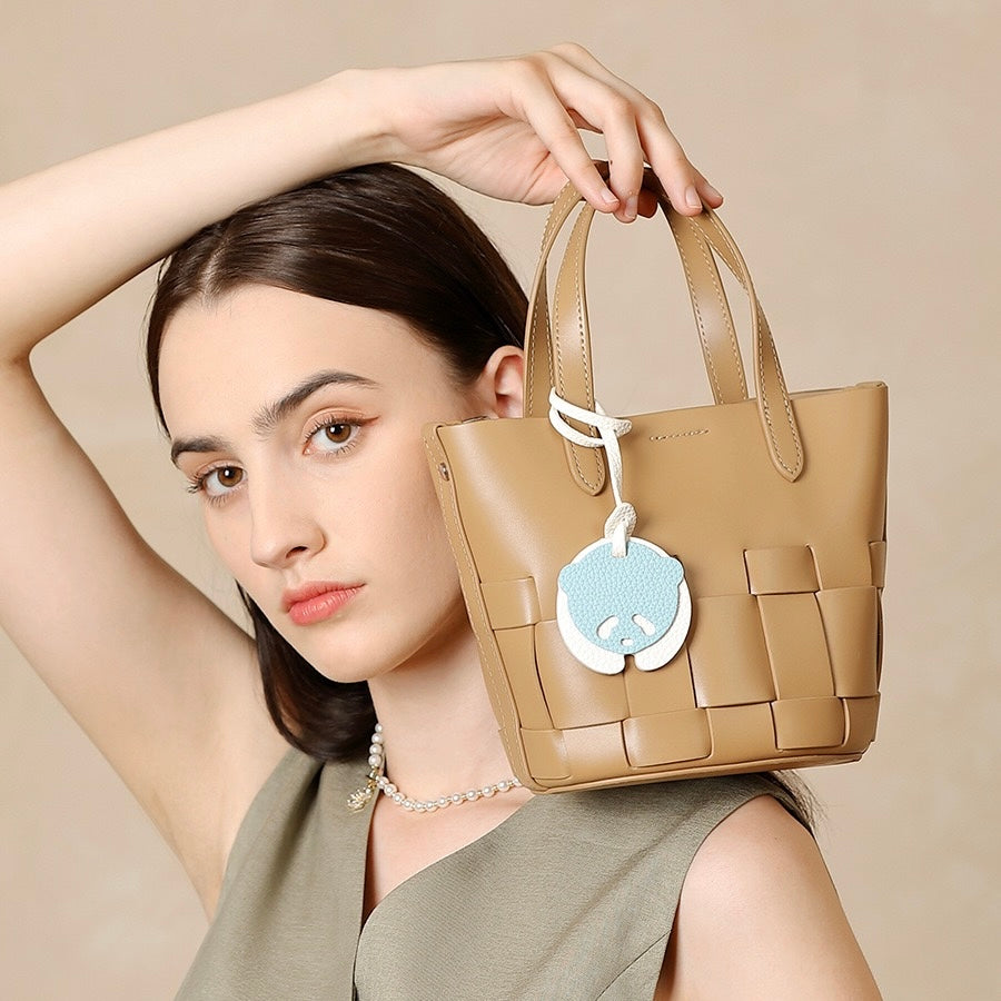 Women's Handmade Genuine Leather Woven Picnic Basket Bag With Cute Panda Charm