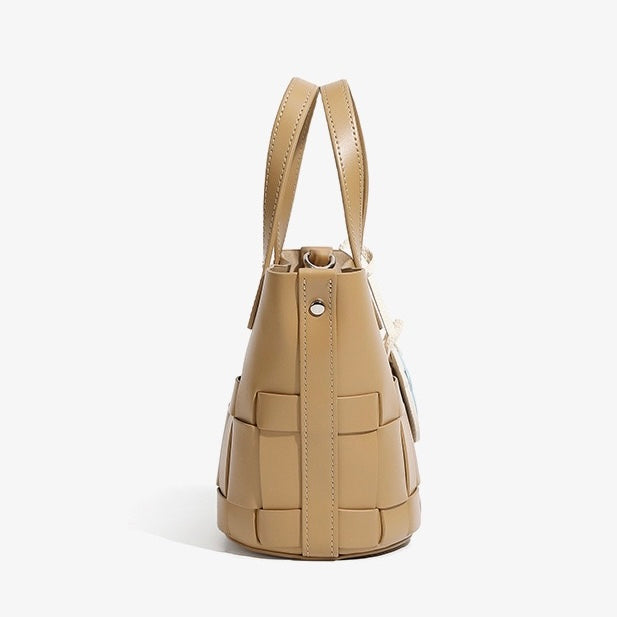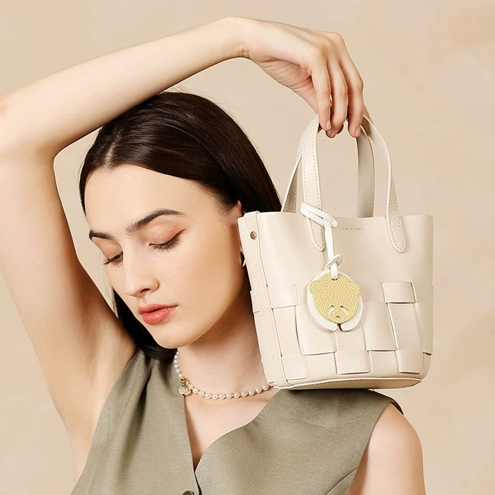 Crafted from genuine leather, this Women's Handmade Genuine Leather Woven Picnic Basket Bag With Cute Panda Charm is a trendy woven-style piece with a practical bucket shape. Sized medium for daily use, it features a secure magnetic snap closure and a fabric lining. Inside, a dedicated ID pocket keeps small essentials organized. With medium hardness, it balances structure and flexibility—perfect for picnics, casual outings, or adding a artisanal touch to your look, blending handmade charm with everyday functionality.
